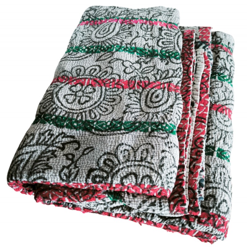 Les recto et verso sont différents, chaque plaid est une pièce unique car il s'agit d'un patchwork réalisé à partir de saris anciens en coton